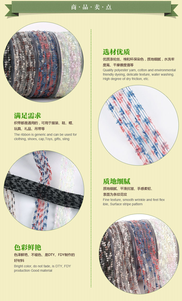 主營(yíng)產(chǎn)品:提花織帶,韓國(guó)織帶,編織帶,仿尼龍織帶,緞帶/羅紋帶,子母織帶,熱轉(zhuǎn)印織帶,間色織帶