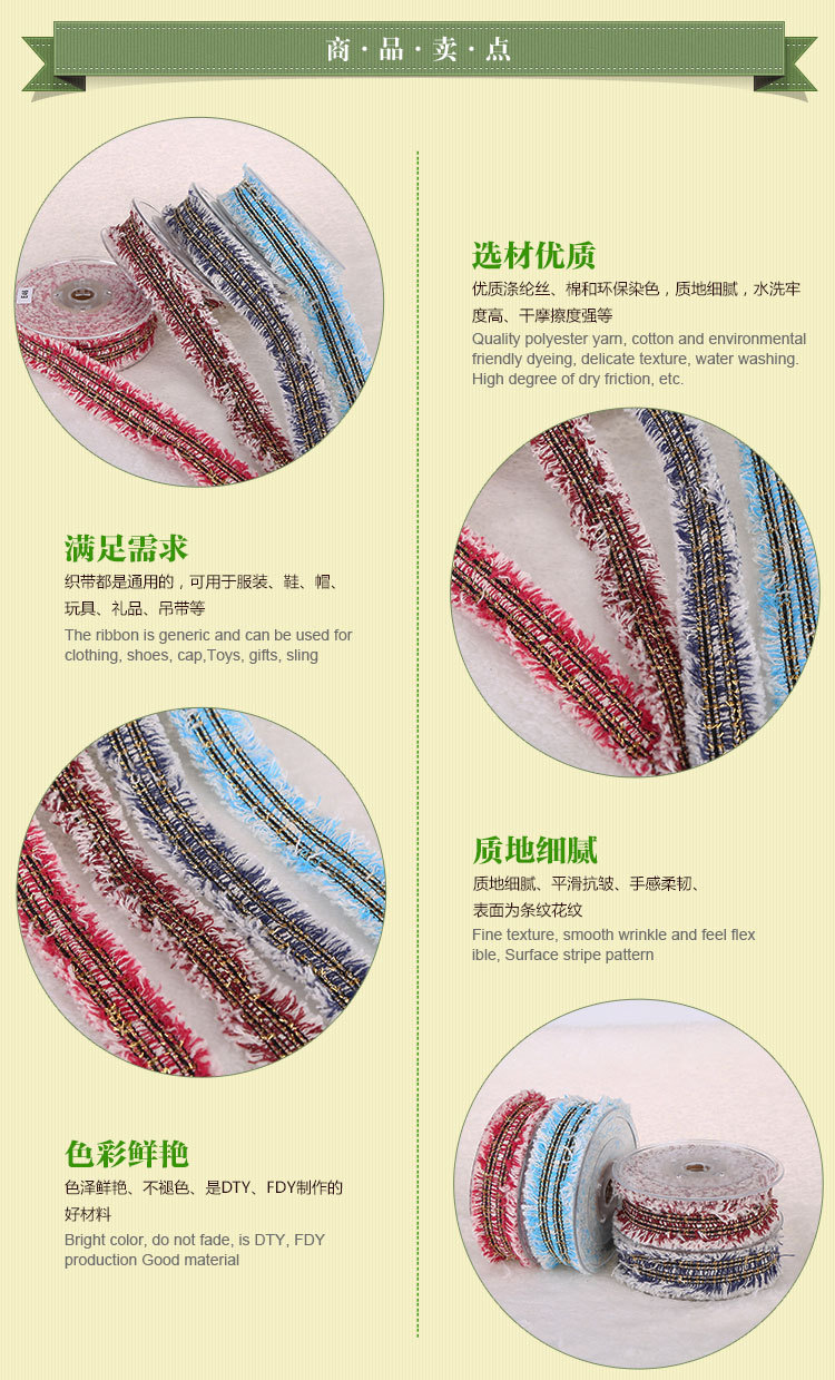 主營產(chǎn)品:提花織帶,韓國織帶,編織帶,仿尼龍織帶,緞帶/羅紋帶,子母織帶,熱轉(zhuǎn)印織帶,間色織帶