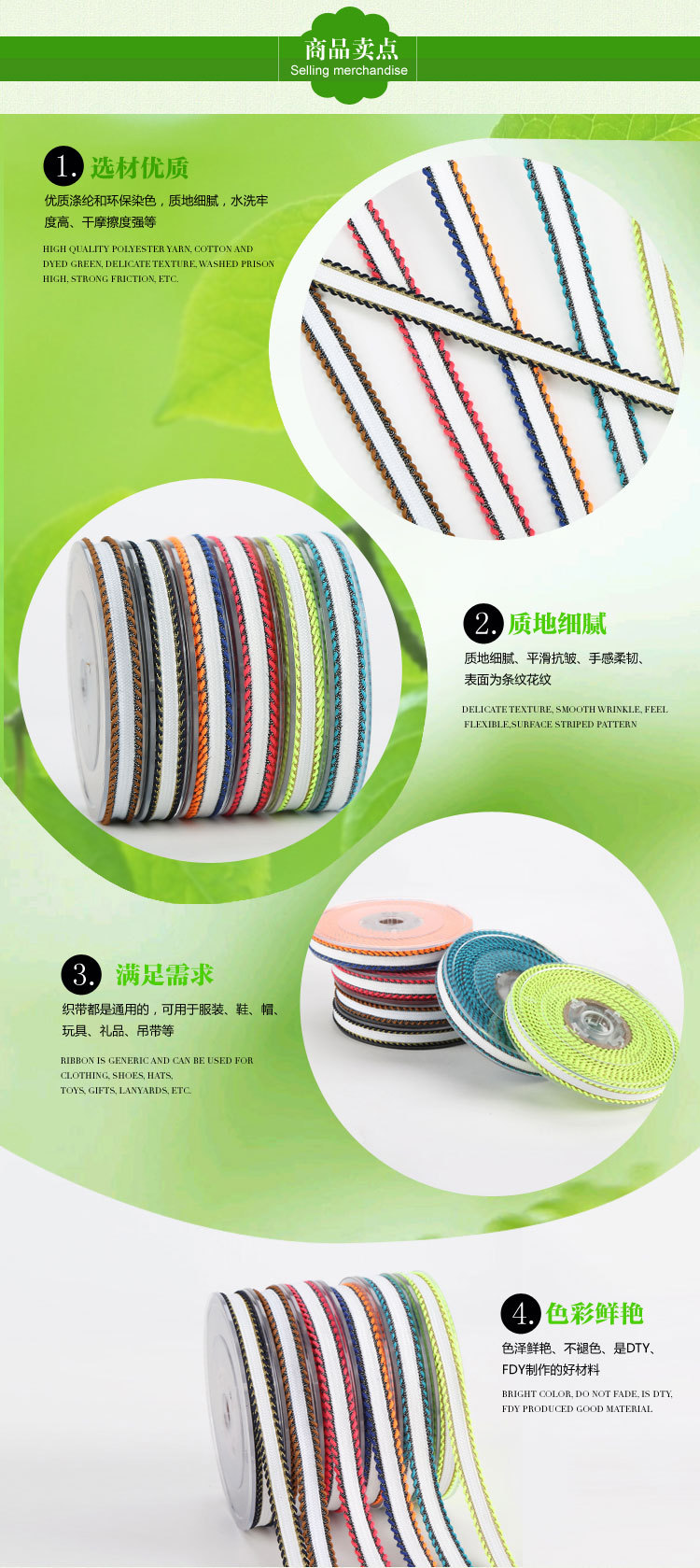 主營(yíng)產(chǎn)品:提花織帶,韓國(guó)織帶,編織帶,仿尼龍織帶,緞帶/羅紋帶,子母織帶,熱轉(zhuǎn)印織帶,間色織帶