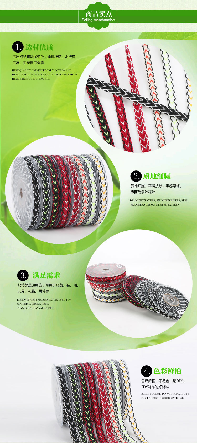 主營(yíng)產(chǎn)品:提花織帶,韓國(guó)織帶,編織帶,仿尼龍織帶,緞帶/羅紋帶,子母織帶,熱轉(zhuǎn)印織帶,間色織帶